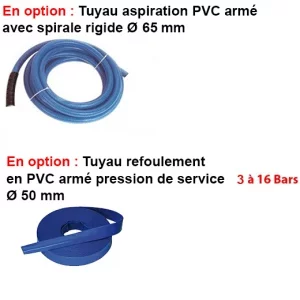 Motopompe haute pression avec motorisation Robin-Subaru. Débit de 600 litres/min et pression de 7 Bars. Accessoires standards fournis : crépine, raccords et colliers. Pompe: Type de pompe: Auto-amorcante Ø du raccord d’aspiration: 65 mm Ø du raccord de refoulement: 50 mm Débit maximum: 600 litres/min (36 m3/h) Pression: 7 bars Hauteur manométrique Totale: 70 m Hauteur d’aspiration maximum: 8 m Granulométrie (Ø trou de crépine): 2,5 mm Garniture mécanique: Carbone céramique Moteur: Moteur ROBIN SUBARU EX27 – 4 temps essence Carburant: essence sans Plomb 95 Capacité du réservoir: 6,1 litres Autonomie moyenne: 2 h 30 Sécurité manque d’huile: oui électronique Autres: Dimensions LxlxH (mm): 520 x 470 x 530 Poids: 44 kg Accessoires standards fournis : crépine, raccords et colliers Accessoires disponibles lors de votre commande (voir plus haut): • Tuyau d’aspiration Ø 65 mm • Tuyau de refoulement Ø 50 mm • Kit brouette Accessoires disponibles sur demande (nous contacter): • Lance pompier avec robinet d’arrêt • Raccord pompier et clé pour raccord pompier
