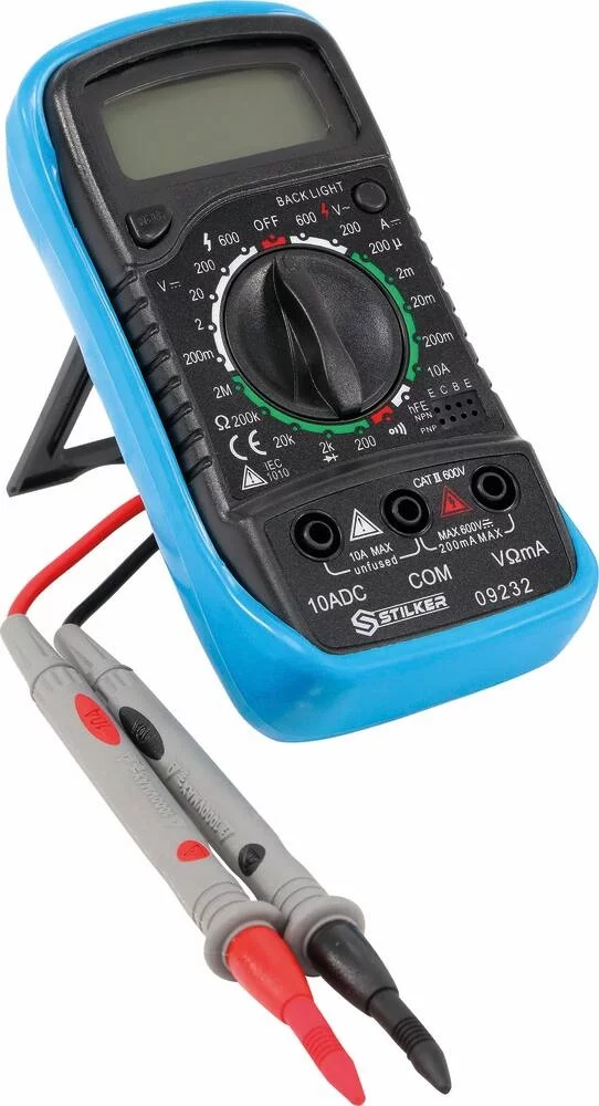 Multimetre digital Stilker. Ecran 4 chifre Protection anti choc avec bequille Tension continue : 200m/2V +- 0,5% – 20/200/600V +- 0,8% Tension alternative : 200/600V +- 1,5%Courant continu : 200u/2m/20mA +- 1% – 200mA +- 2% – 10A +- 3% Résistance : 200/2k/20k/200k/2M ohms +- 1%,Test de diode, test de continu sonoreAlimentation : 6F22 ( 9V ) x1Dimensions : 138x69x31 mm Poids : 170 gr Livré avec pile et cordons.
