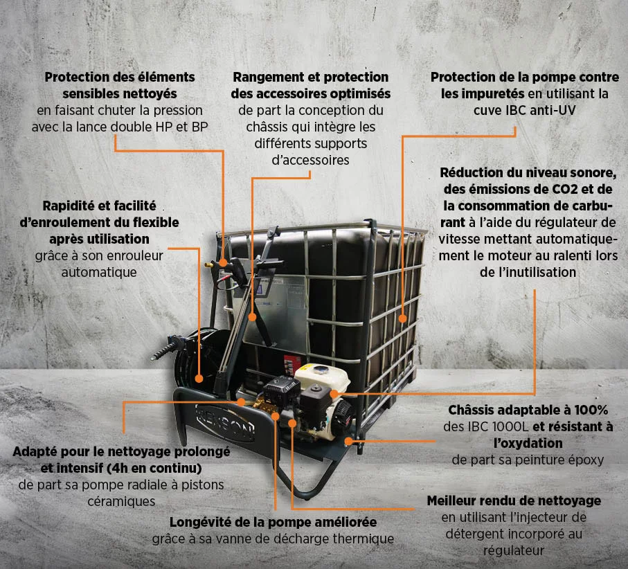 100 % autonome , il peut s’adapter à un réservoir IBC de 1 000 L pour des interventions prolongées.