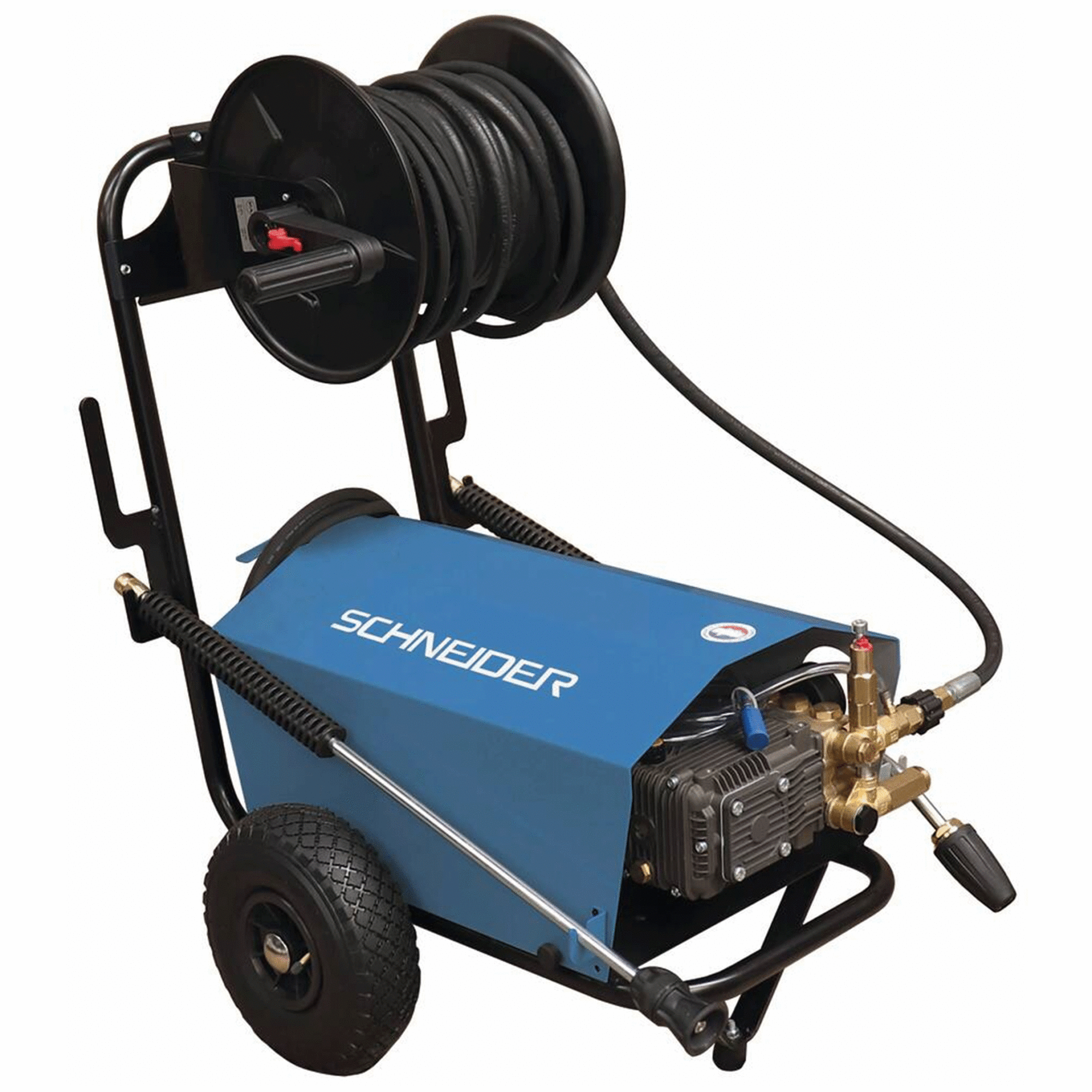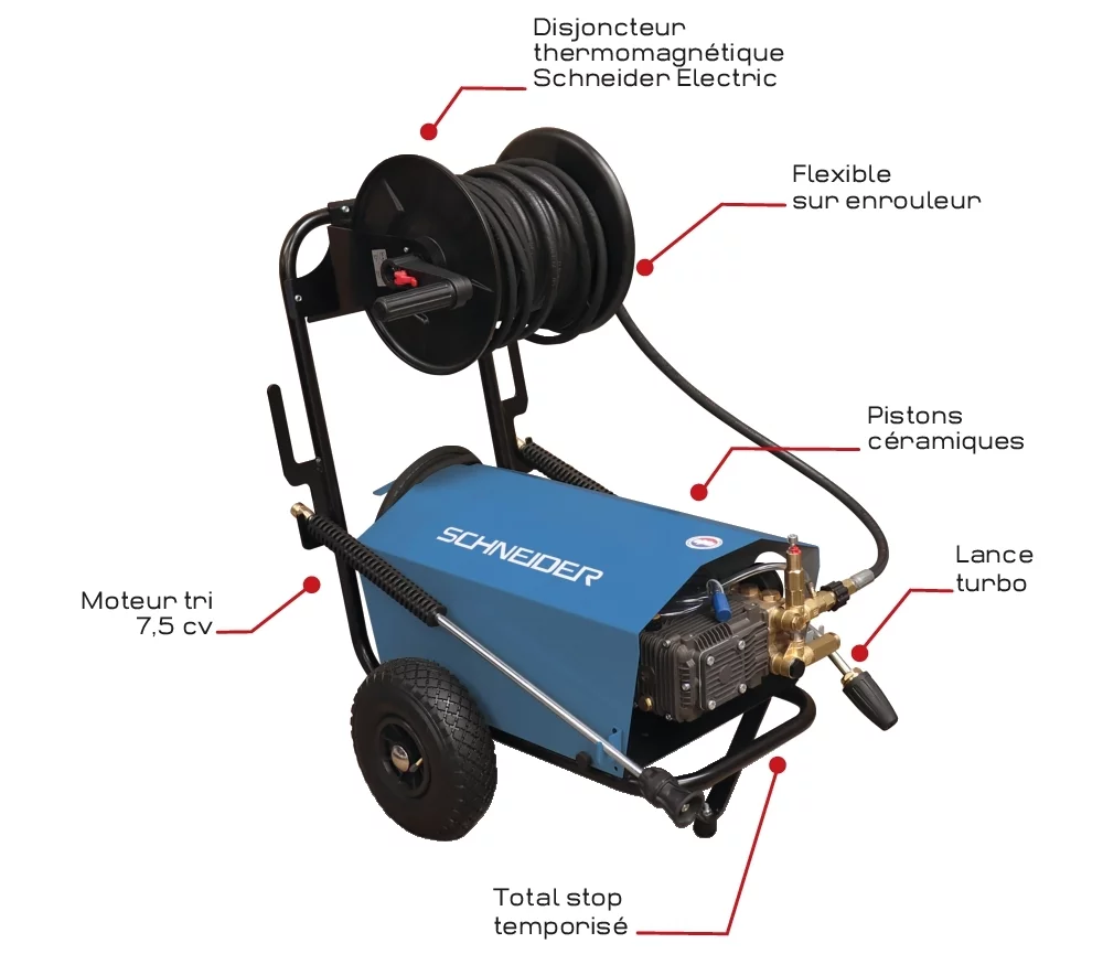 Nettoyeur HP eau froide 380V 21 l/min 150 bar total stop avec enrouleur de flexible 20 m et lance turbo