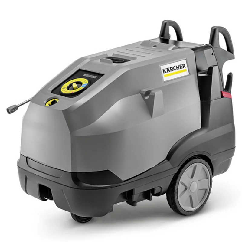 Nettoyeur haute pression à eau chaude KÄRCHER. Nettoyeur extrêmement résistant et équipé d’un moteur triphasé refroidi par eau. Le chargement et le transport de cet appareil dans les véhicules est facilité par ses anneaux d’arrimage. Cependant la grande originalité de ce nettoyeur haute pression réside dans son système de protection de la machinerie et du serpentin contre le calcaire et la corrosion. Sa durée de vie s’en trouve ainsi prolongée.
