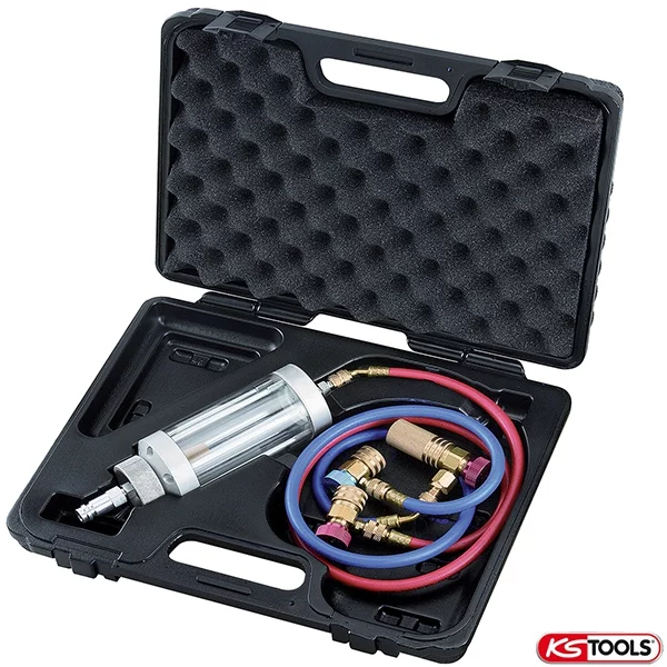 Outil de diagnostic de climatisation, détecte avec fiabilité les problèmes d’huile, produits de contraste, particules, copeaux, eau et d’autres corps étrangers. Utilisation avec ou sans climatisation. Marque: Ks tools Capacité: 70 ml Diamètre: 70 mm Longueur:  230 mm Pression max: 25 bar Température max: 50°C Poids: 1 kg