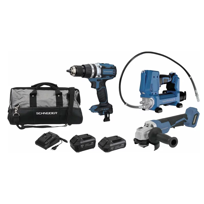 Ce pack complet comprend une perceuse-visseuse 20V, une meuleuse d’angle brushless, une pompe à graisse, deux batteries Li-ion, et un chargeur rapide. Vous bénéficiez également d’un sac de rangement pratique et d’une tension de 20V assurant une performance optimale. L’ensemble, pesant 12,65 kg, est conçu pour répondre à vos besoins en matière de bricolage et d’entretien professionnel.