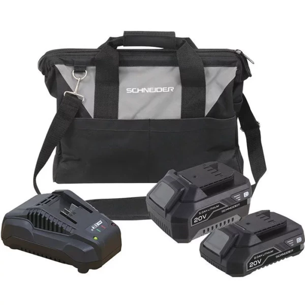 Pack 2 batteries + chargeur + sac de transport. – 2 batteries Li-ion 20V 5Ah.  – 1 chargeur rapide 3A. – 1 sac porte-outils textile idéal 2 a 3 outils.