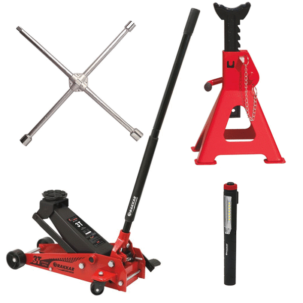 Pack de levage de la marque DRAKKAR. Ce pack est composé d’un cric rouleur 3 tonnes, de deux chandelles 3 tonnes, d’une lampe torche et d’une clé en croix. Parfait pour le montage et le démontage d’une roue d’une voiture.