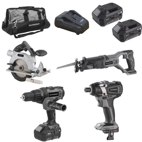 Pack électroportatif de la marque SCHNEIDER. Ce pack ce compose d’une scie sabre, d’une visseuse à choc, d’une scie circulaire, d’une perceuse à percussion, avec le chargeur et deux batteries 4Ah le tout dans un sac de transport textile de qualité.