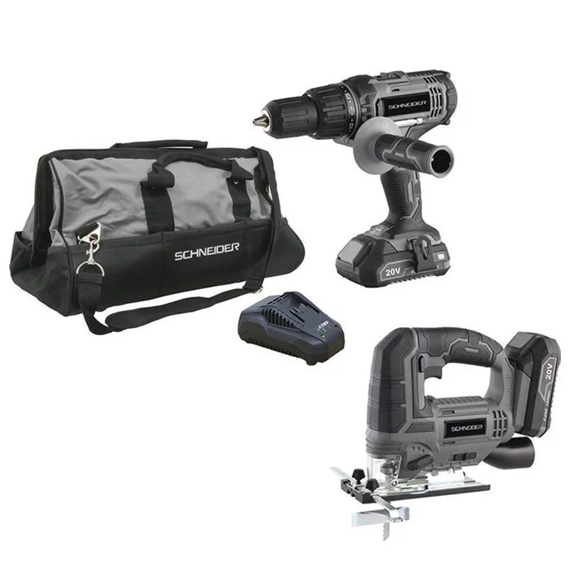Pack 20V perceuse 50Nm scie sauteuse 2 batteries 2Ah Li-ion sac de transport.