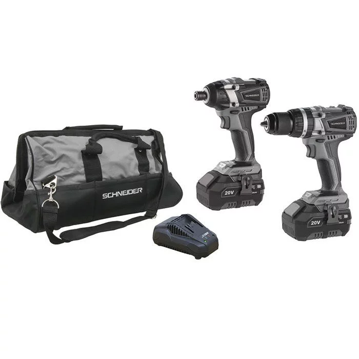 Pack 20V Perceuse 60Nm plus une visseuse à chocs plus 2 batteries 5Ah Li-ion et pour finir unsac de transport de la marque SCHNEIDER. Ce pack vous permet de vous équiper en outils professionnels.