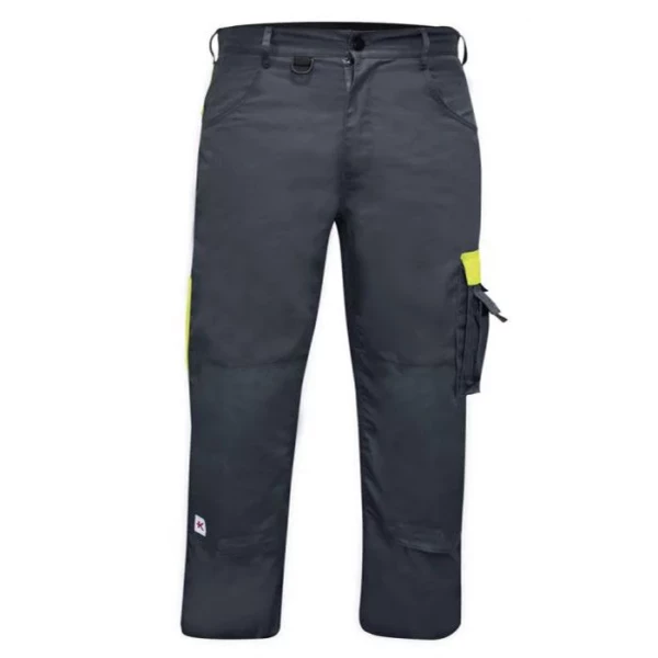 Pantalon avec des rangements et des poches pratiques. Pantalon de couleur gris est bien adaptée aux conditions de travail  et d’environnement logistique. Tout en gardant un aspect frais grâce aux détails de couleur contraste. Le pantalon de travail comprend des poches latérales pratiques. Le système de règlage en largeur permet de l’adapter au mieux à votre taille. Muni de poches pour une protection supplémentaire des genoux. Vêtement très confortable. Marque: KRAFTWERK Couleur: Gris/lime Matériau: 65% de coton / 35% de polyester Homologation: CE-EN340