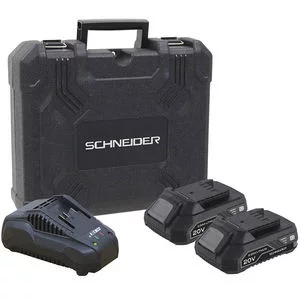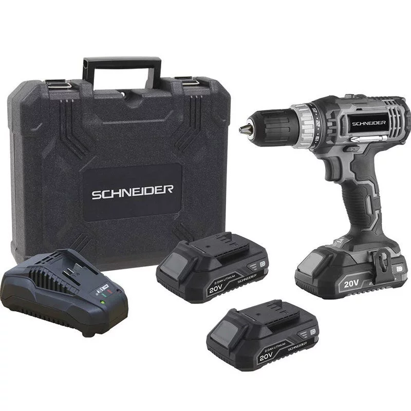 Perceuse visseuse sans fil SCHNEIDER livrée avec 2 batteries Li-ion 2AH + 1 chargeur rapide 2,4A , dans un coffret de rangement .