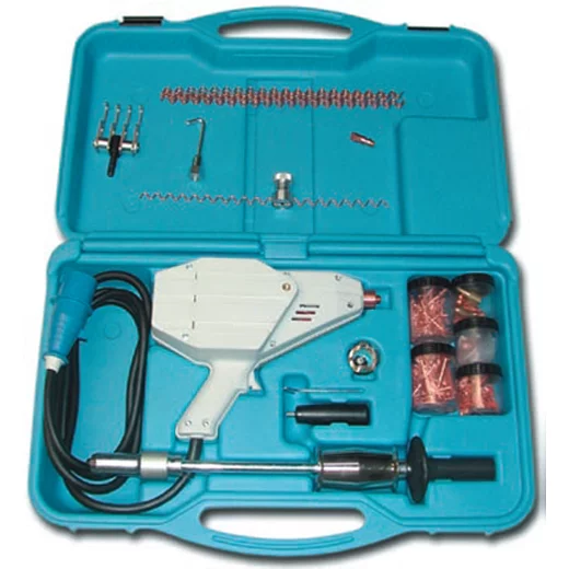 Pistolet à souder tire-creux, livré avec crochet, peigne, électrode magnétique, permet le soudage des fils ondulés. Alimentation: 230 V mono Livré avec: • crochet • peigne • électrode magnétique Permet le soudage des fils ondulés