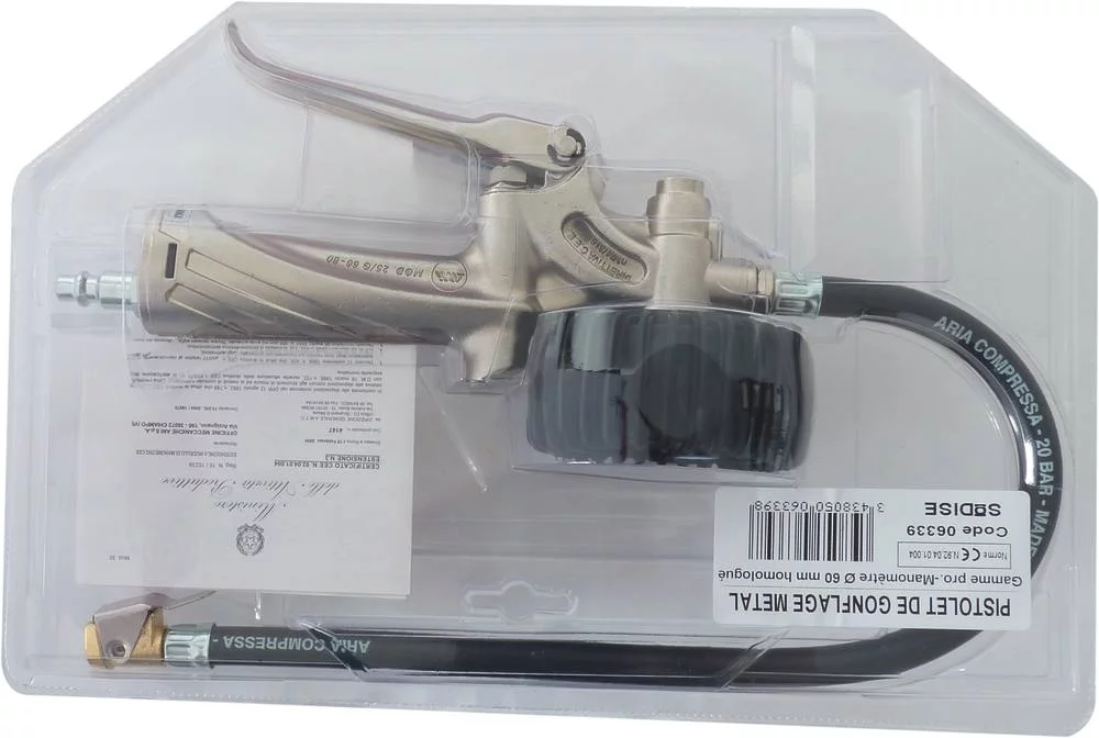 Corps entièrement métallique de 1/4″. Manomètre homologué de 60 mm de diamètre avec une graduation de 0 à 10 bar. Équipé d’un raccord rapide.