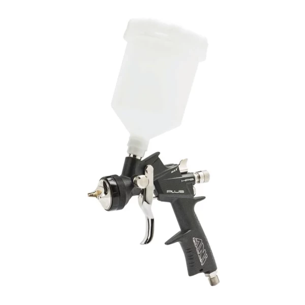 Le chapeau de pulvérisation en laiton nickelé permet une atomisation fine, assurant une finition homogène sur toutes les surfaces.