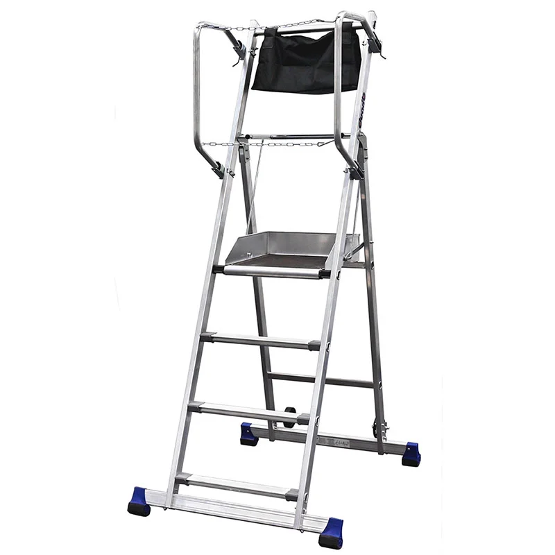 La plateforme est équipée d’un garde-corps et chaînettes pour une protection à 360°. De plus, la plateforme est équipée d’un sac porte-outils d’une capacité de 15 kg. Sa forme est également conçue pour faciliter le travail. Enfin, une poignée de transport est intégrée pour faciliter le déplacement de la plateforme.