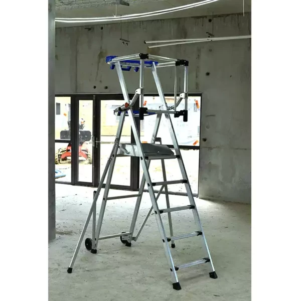 Ainsi la plate-forme est solide. Elle supporte jusqu’à 150 kg. Vous pouvez y monter avec vos outils sans problème. Ainsi une tablette intégrée vous permet de garder vos outils à portée de main. C’est pratique, surtout lors de travaux de peinture, d’entretien ou d’électricité.