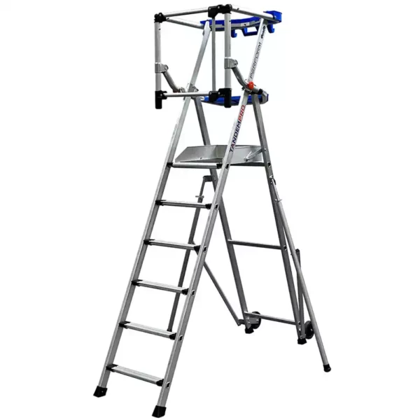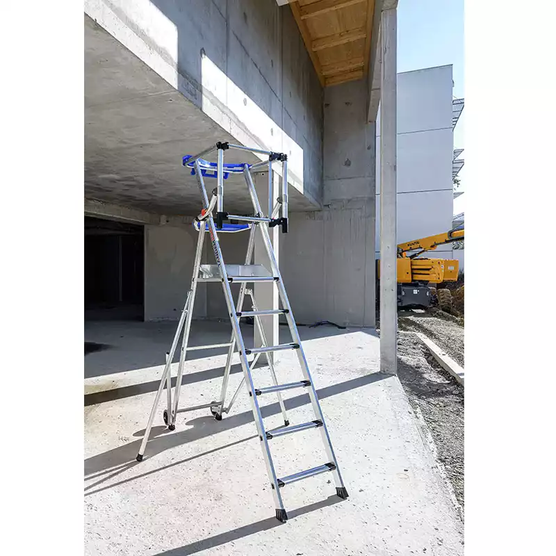 La plateforme est équipée d’un garde-corps rigide et articulé pour une protection arrière. Ce garde-corps peut être mis en place facilement en un seul geste. De plus, la plateforme est équipée de deux tablettes, une supérieure et une inférieure, pour permettre de travailler au plus près du mur. Sa forme est également conçue pour faciliter le travail.
