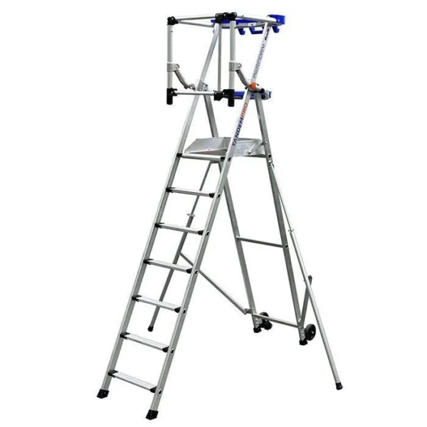 La plateforme est équipée d’un garde-corps rigide et articulé pour une protection arrière. Ce garde-corps peut être mis en place facilement en un seul geste. De plus, la plateforme est équipée de deux tablettes, une supérieure et une inférieure, pour permettre de travailler au plus près du mur. Sa forme est également conçue pour faciliter le travail. Enfin, une poignée de transport est intégrée pour faciliter le déplacement de la plateforme. Caractéristiques : Hauteur travail maxi : 3,70 mètres. Hauteur plancher : 1.70 m. Dim. plié: H 3.18 m x L 0.67 m x Ep 0.32 m. Plancher antidérapant 0.50 x 0.40 m. 7 marches (plancher compris). 2 stabilisateurs. Aluminium. Plate-forme à hauteur fixe. Plinthes hauteur 100 mm. Charge utile 150 kg. Marches antidérapantes de 60 mm. 2 tablettes de série avec compartiments. 2 crochets porte seau. Roues Ø 150 mm non marquantes. Assemblage par sertissage. Fabrication française. Décret 2004-924 / Normes PIRL – EN 131-7. Poids: 27,1 kg.