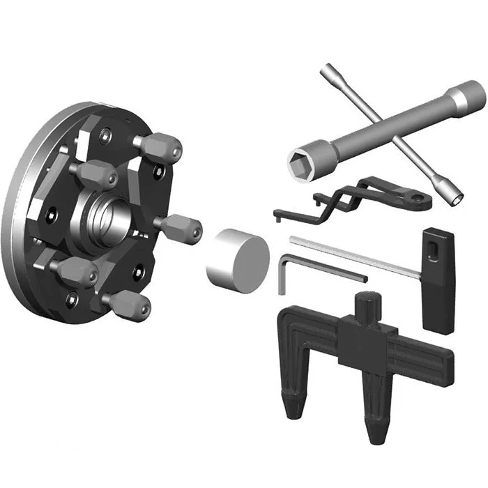 Plateau universel de centrage très précis de qualité, pour roues à centre fermé, pour jante à 3, 4 et 5 trous avec un diamètre de 95 à 205 mm. 1 Plateau universel pour roues à centre fermé Pour jantes à 3,4 et 56 trous Diamètre de 95 à 205 mm
