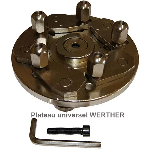 Plateau universel pour équilibreuse de roue WERTHER OLIMP 2500, OILMP 6000, OLIMP 6000C et 9500. Possibilité de transformer le plateau en 3, 4  et 5 trous, alésage 40 mm. 1 Plateau Universel pour équilibreuses de roues Werther OLIMP 2500, 6000, 6000C et 9500 1 clé Allen Alésage: 40 mm