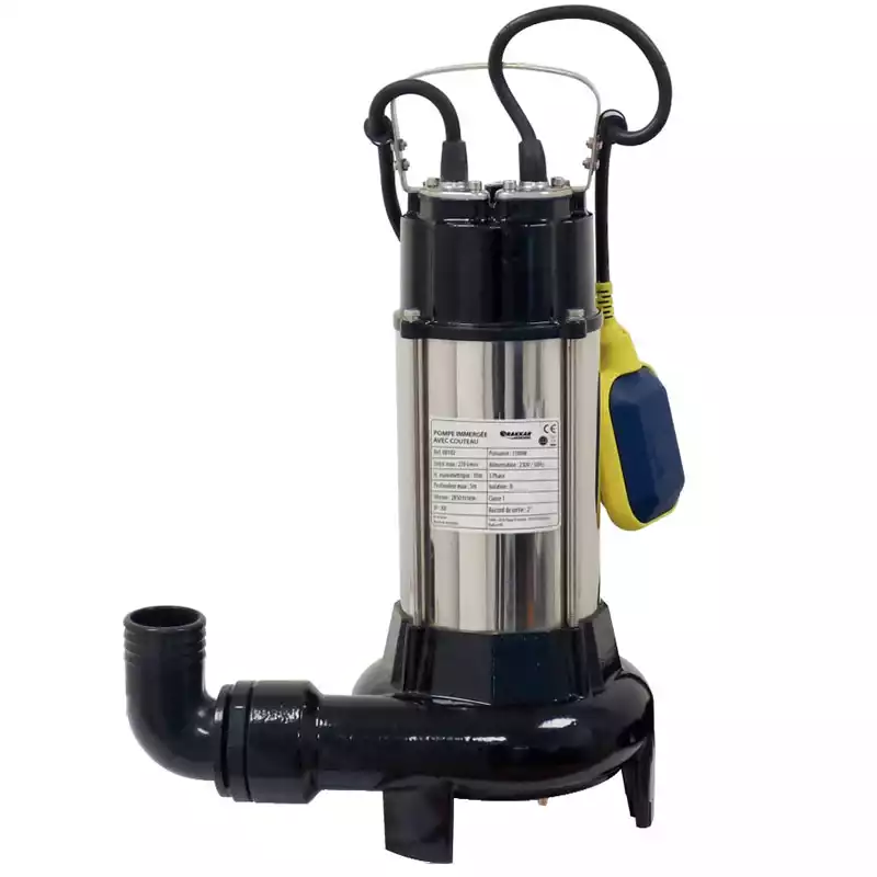 Pompe à eau immergée automatique fonte avec couteau 230 V 1100 W avec flotteur. Avec couteau rotatif 3 lames. Contrôlée par flotteur. Pompe immergée avec corps en acier/inox et fonte.