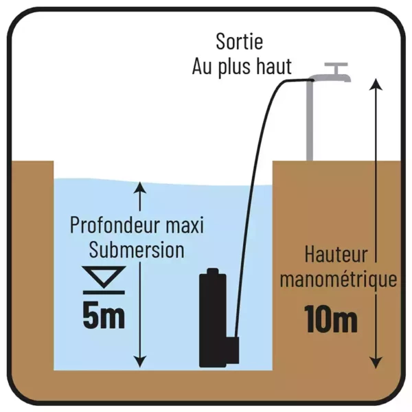 Cette pompe peut atteindre un débit élevé. Elle aspire jusqu’à 15 000 litres d’eau par heure, ce qui permet un travail rapide. Son corps en plastique solide résiste bien à l’usure. De plus, elle est légère et facile à transporter grâce à sa poignée intégrée. Elle s’adapte à plusieurs types de tuyaux et peut fonctionner avec de l’eau claire ou légèrement sale. Elle est aussi équipée d’un flotteur pour gérer automatiquement le démarrage et l’arrêt.