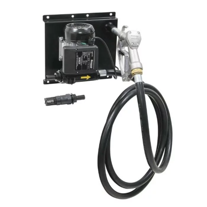 Pompe à gasoil 230V 60 litres/min station murale. Elle intègre un pistolet métallique manuel est un tuyau gasoil avec une longueur de 4 mètres. Elle est de couleur noir. Livrée sans tuyau d’aspiration.