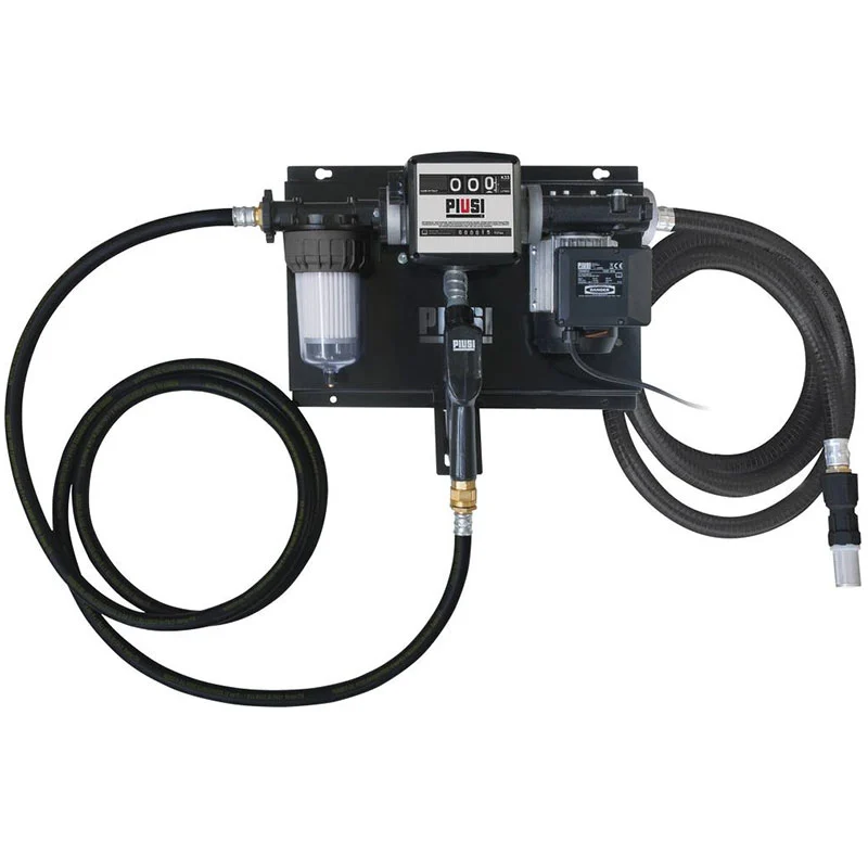 Station de transfert gasoil à usage privé. Facile à installer, mobile et compacte, utilisable là où il est nécessaire de compléter des réservoirs mobiles ou enterrés par le groupe de distribution. Elle peut être intégrée dans un coffre métallique pour la protection des composants. Le filtre transparent permet de visualiser l’encrassement du filtre et de purger l’eau.