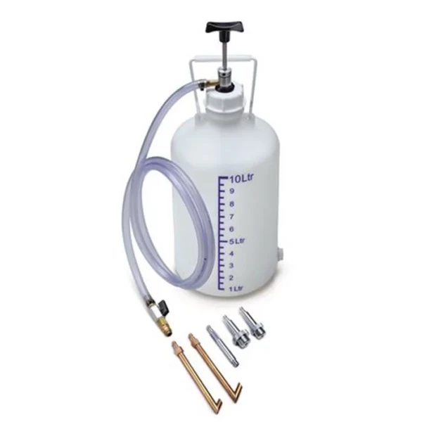 Pompe à huile de transmission de 10 litres avec 5 adaptateurs, très pratique pour le remplissage des boîtes de vitesses. Caractéristiques : Marque : Leitenberger Capacité : 10 litres Longueur de tuyau : 2 mètres