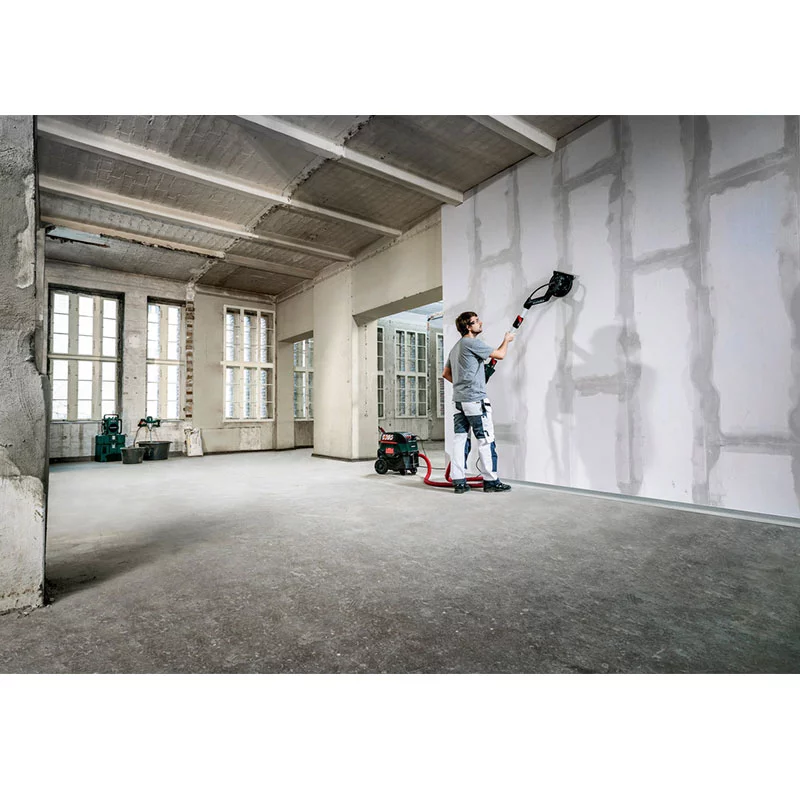 Ponceuse à bras 225 mm METBAO. Cette ponceuse est parfaite pour le ponçage des surfaces enduites sur les murs et les plafonds. Elle est équipée de la technologie M-Clean, qui aspire les poussières efficacement à travers le carter, sans tuyau, d’une lampe LED pour la détection et le travail directs des irrégularités et des rainures, et d’une possibilité de réduire ou augmenter la longueur du bras sans outil.