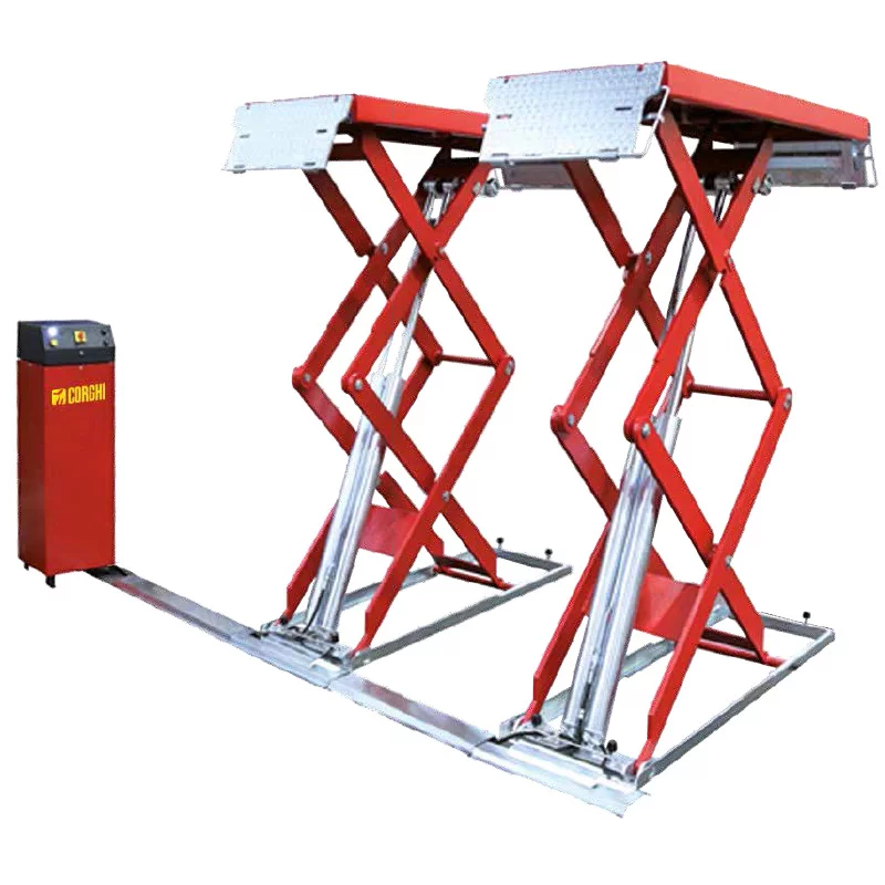 Pont élévateur électrohydraulique dessous de caisse à double ciseaux CORGHI ERCO C632 EF, capacité 3,2 tonnes. Conçu pour garagistes, réparateurs de voitures et carrossiers. Alignement précis des chemins de roulement grâce à un double système de vérins MASTER/SLAVE sans crémaillères, garantissant robustesse et fiabilité.