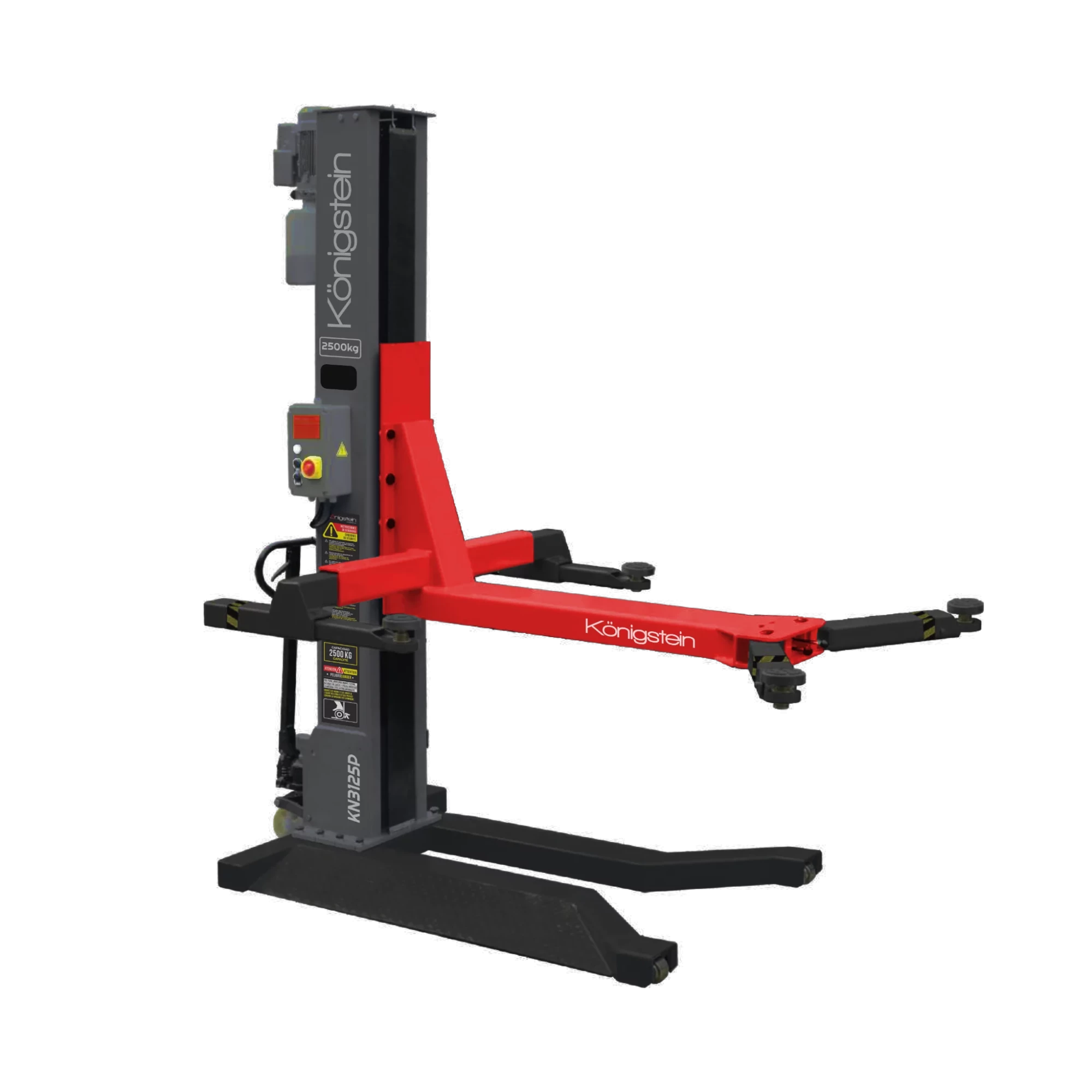 Pont mobile KÖNIGSTEIN mono colonne de 2,5 tonnes. Le pont élévateur hydraulique mobile à une colonne est le meilleur choix pour un garagiste, s’il y a une contrainte de place dans l’atelier. Ce pont mono-colonne est spécialement conçus pour les ateliers professionnels. Pont 1 colonne équipé de bras de charge amovibles avec des supports en caoutchouc réglable en hauteur. Il est possible de bloquer et débloquer manuellement les bras de charge. Pont électrohydraulique équipé de bras de levage asymétriques à trois étages. Les chariots sont munis de tampons en caoutchouc pour protéger les portières. Le tableau électrique dispose de commandes ergonomiques. argue soulevée. Pont électrohydraulique équipé de bras de levage asymétriques à trois étages. Les chariots sont munis de tampons en caoutchouc pour protéger les portières. Le tableau électrique dispose de commandes ergonomiques.