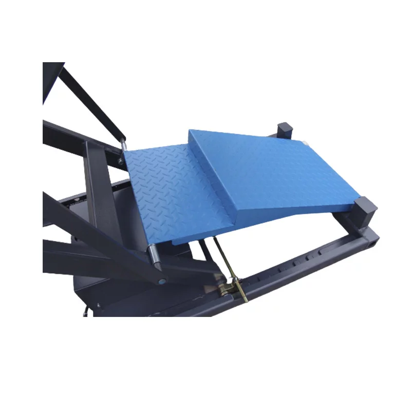 Table élévatrice fixe hydraulique pour moto, avec une pompe hydraulique, équipée d’une plaque centrale en aluminium pour la stabilité des béquilles.