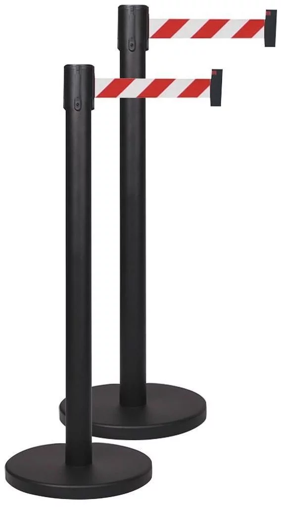 Poteau avec dérouleur de sangle automatique pour délimité une zone de travail. Longueur sangle : 2,3 mètres Largeur sangle : 4,8 cm. Hauteur du poteau : 91 cm. Diamètre du poteau : 6,3 cm. Socle lesté + protection caoutchouc pour protéger le sol. Matériau poteau : acier peint en noir.