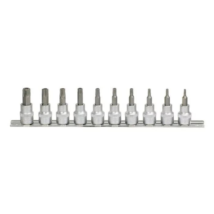 Rail de 10 douilles tournevis percé 3/8 », TB10 à TB55 avec carré d’entraînement intérieur selon DIN 3120 / ISO 1174 et encoche pour verrouillage par bille.  Embout en acier nickelé, Finition chromée satinée, Chrome Vanadium, Comprend un rail de rangement Données Techniques :  Pièces dans le set : 10 pièces Taille en TORX® : T10-T15-T20-T25-T27-T30-T40-T45-T50-T55 Carré d’entraînement en pouce : 3/8″ Poids : 400 g