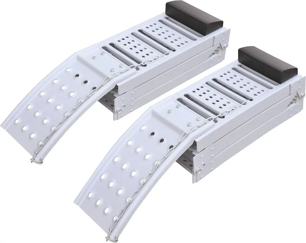 Rampes de chargement pliable en acier. Pour le chargement d’une moto sur un plateau ou, en combinant 2 rampes pliées, pour la surélévation d’un véhicule. 2 en 1: rampes de chargement et rampe de levage. Pliable en 3 parties. Vendu par 2
