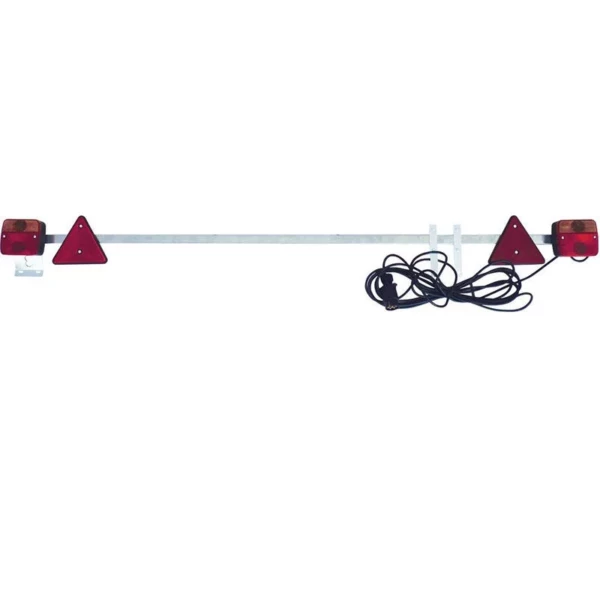 Rampe d’éclairage arrière pour vehicule, 4 fonctions feux position, stop, clignotant, éclaireur de plaque, rampe livrée complète avec lampes, câble, prise, triangles montés. Marque: Sodiflash Tention: 12 V Prise: 7 Plots Longueur cable: 12 Mètres Longueur rampe: 1600 mm 4 fonctions : position, stop, clignotant, éclaireur de plaque. Poids: 2,8 kg