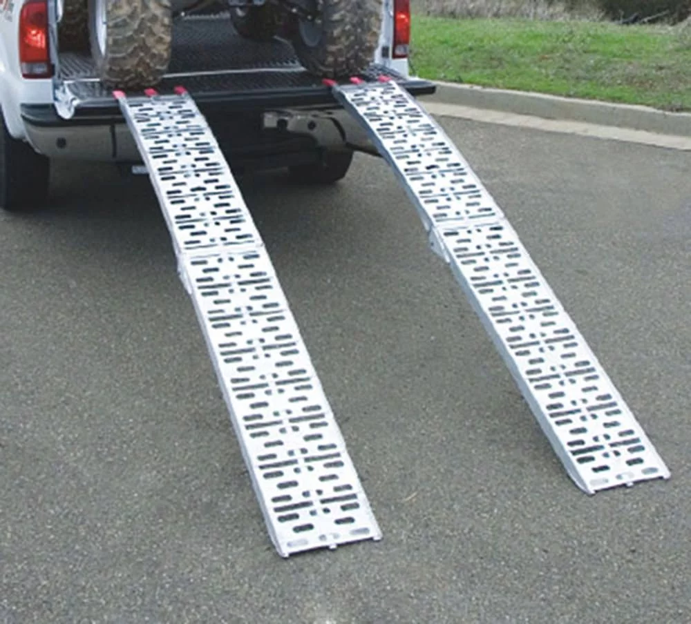Rampes aluminium pliantes en 2 parties et un support en caoutchouc. Garantie 3 ans. Caractéristiques: Lot de 2 rampes Charge supportée par paire 680 KG Dimensions : 2000x280x50 mm Poids : 13.2kg (par paire)