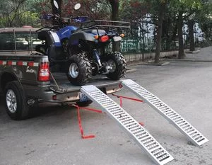 Rampes de chargement pliable en acier. Pour le chargement d’une moto sur un plateau ou, en combinant 2 rampes pliées, pour la surélévation d’un véhicule. 2 en 1: rampes de chargement et rampe de levage. Pliable en 3 parties. Vendu par 2