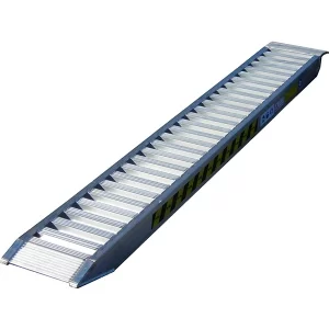 Rampe de chargements sans bord. Rampe de chargements avec surface antidérapante. Section des profilés renforcés, légères très résistantes grâce à sa conception en aluminium et sécurisé grâce à son système d’attache par accroche. Idéales pour charger. tous types d’engins. Vendues par paire Marque : IMER Capacité de charge pour la paire pour engins à chenilles ou à roues pneumatiques : Empattement : 1,5 mètre : 3365 Kg 1,75 mètre : 3670 Kg 2 mètres : 4035 Kg Charge concentré pour chariots élévateurs. : 2490 Kg Dimensions des rampes : Longueur : 4500 mm Largeur intérieur : 310 mm Largeur extérieur : 390 mm Poids de la paire : 105 Kg
