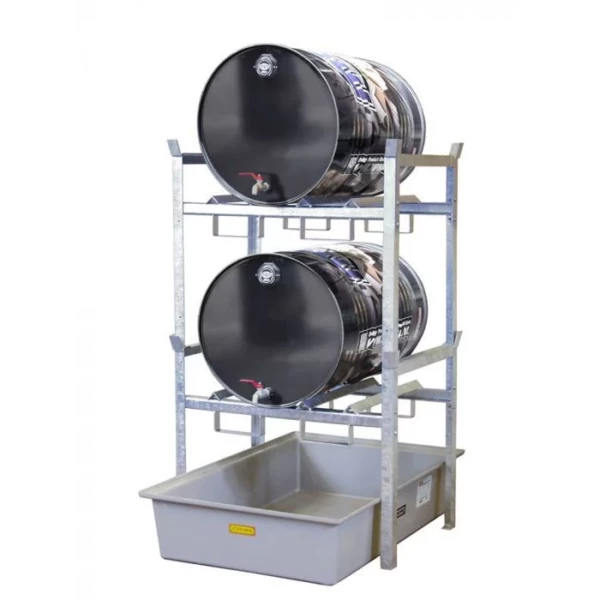 Rayonnage pour un bon stockage des récipients d’huile qui fait gagner de la place. Rayonnage entièrement galvanisé à chaud, équipé d’un bac récupérateur GFK résistant à la corrosion pour un usage sûr longue durée. Convient pour récipients 60 et 200 litres. Sans porte-verseuse voir en option.