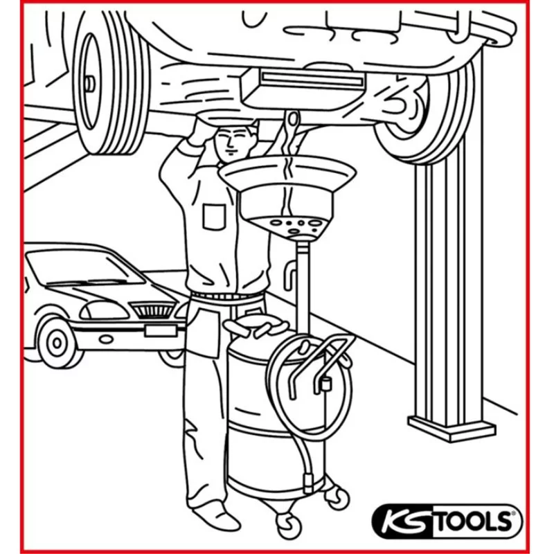 Récupérateur d’huile par gravité 65 litres KSTOOLS, vidange pneumatique avec mano de pression intégré, durée de la vidange environ 3 minutes à 0,8 bar, niveau de remplissage par tube, flexible d’écoulement, 4 roues, 2 fixes et 2 pivotantes, poignée de manutention.