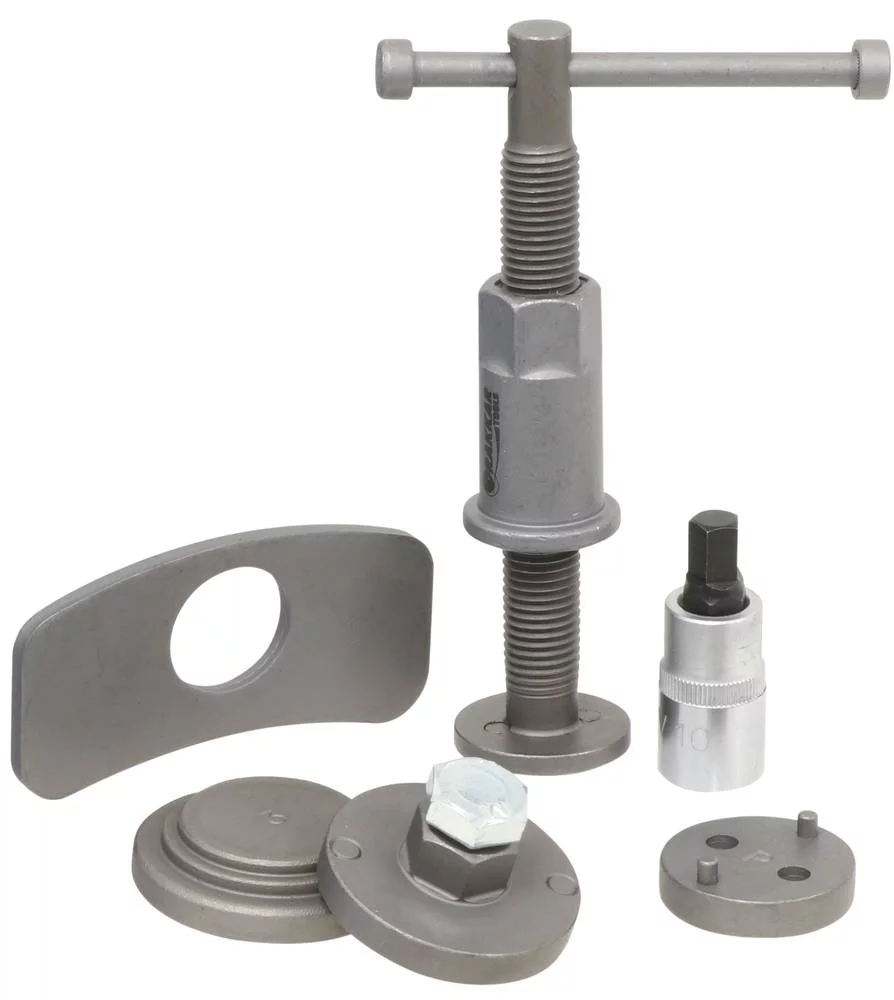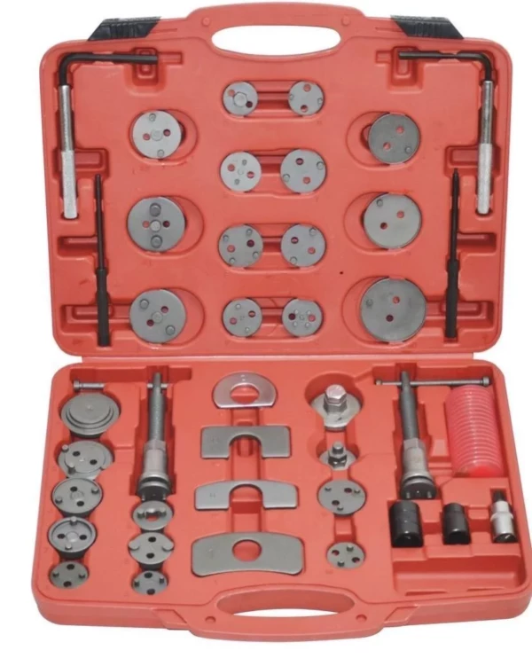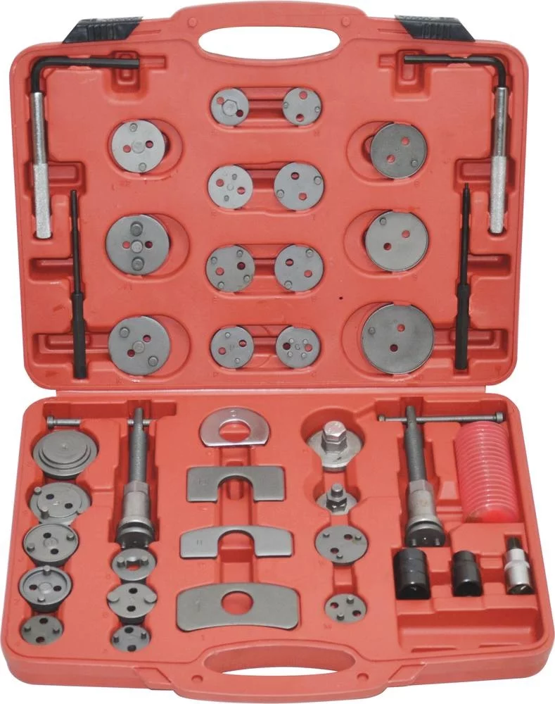 Repousse piston pour intervention sur véhicule 40 pcs Coffret composé de : – 1 tourne à gauche – 1 tourne à droite – 4 plaques d’effort – 26 adaptateurs – 2 clés 6 pans mâles allongées (6-7mm) – 2 chasses goupille – 1 douille 14mm – 1 douilles 19mm – 1 douille 6 pans mâle 10mm – 1 flacon de graisse