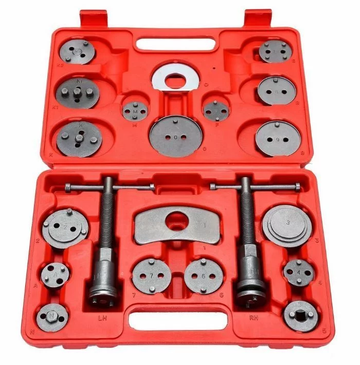 Repousse piston pour étrier de frein. Permet de pousser et tourner les pistons de freins. Le piston peut être poussé et tourné en une seule opération. -coffret 21 pc Coffret composé de:  -1 tourne à gauche  -1 tourne a droite  – 2 plaques d’effort: 0-1 -17 adaptateurs  Dimensions: 325x255x55mm poids: 3kg