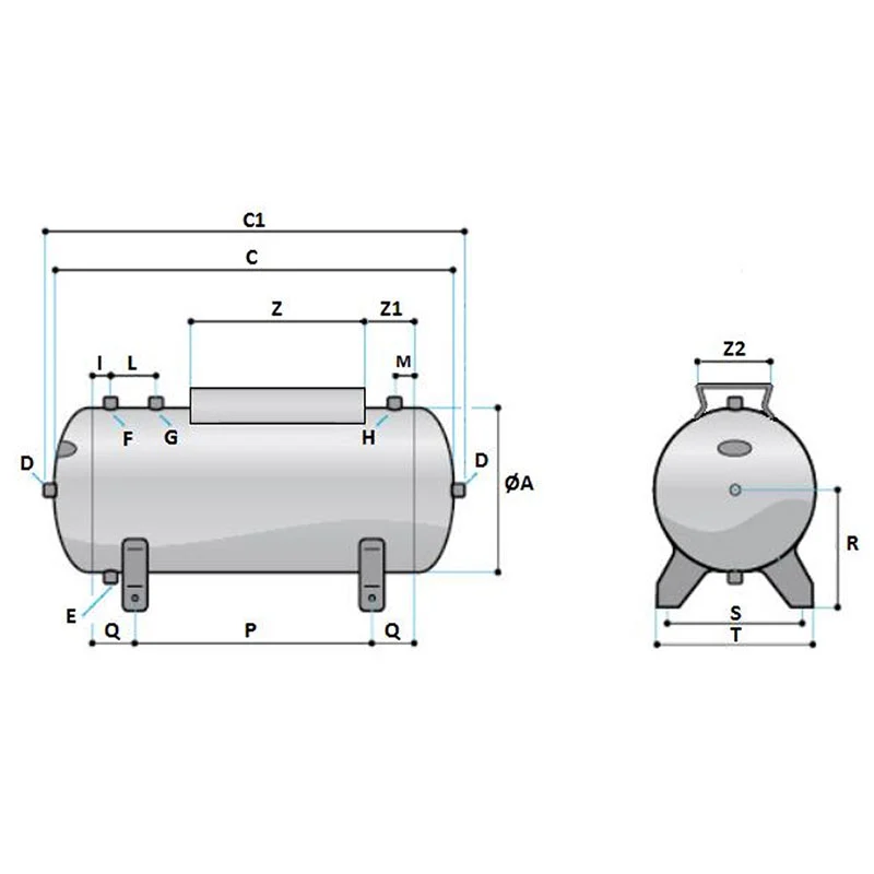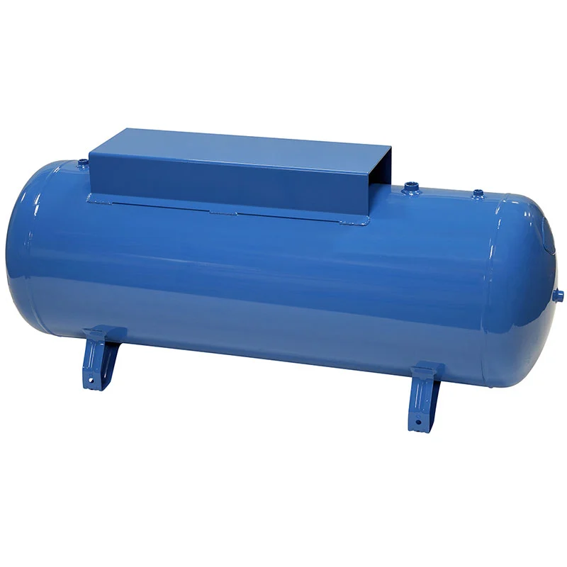 Réservoir d’air comprimé horizontal avec plaque support, capacité de 100 litres et livré avec certificat de conformité et d’épreuve.