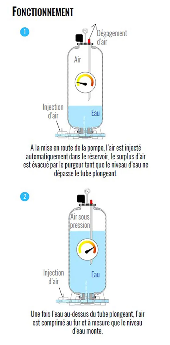 A la mise en route de la pompe, l’air est automatiquement injecté dans le réservoir (via le venturi ou le clapet de renouvellement d’air).