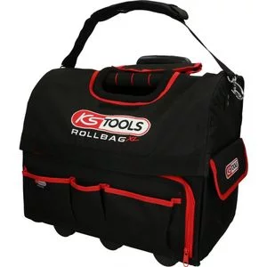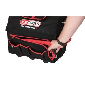 Système de trolley. Poignée de préhension en mousse et sangle d’épaule avec coussin pour plus de confort. Fermeture par rabat à Velcro. Tissu ultra-résistant et soute rigide pour plus de longevité. Nombreuses poches et rangements. Compartiment à scie renforcé. Cloison spéciale pour tournevis et clés. Support pour mètre-ruban.