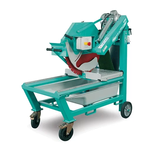 Scie à matériaux électrique IMER. Moteur 220 V monophasé 2,2 kW. Cette scie est équipée de 4 roues dont 2 orientables. Conçue pour le découpage de matériaux de grandes dimensions. Elle est livrée sans disque. Garantie IMER de 1 an. Diamètre disque/alésage: 750 mm / 25,4 mm Puissance moteur: 2,2 kW – 230 V Mono Vitesse de rotation du moteur: 1440 Tr/min Longueur de coupe lame baissée / levée: 500 mm / 560 mm Hauteur maxi de coupe: 300 mm Hauteur plan de travail: 675 mm Niveau sonore: 95 Lp dB(A) Livrée sans disque Poids: 202 kg Dimensions (L x l x H): 1550 x 580 x 1600 mm Equipement de série: Prise IP67 Bac de récupération d’eau en plastique Prises fourreaux et point d’ancrage pour levage 4 roues dont 2 orientables avec freins Protections latérales disque Manivelle de réglage hauteur du disque Poignée pour chariot curseur Blocage du chariot pendant le transport