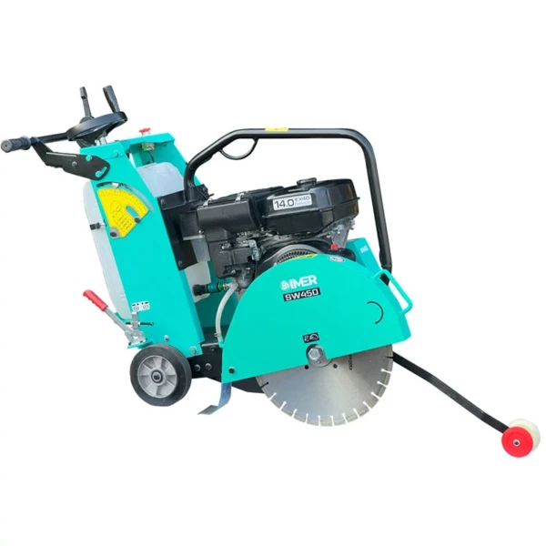 Scie à sol thermique Ø 450 mm IMER. Cette scie à sol robuste, pratique et polyvalente, est équipé d’un guidon réglable qui permet une posture de travail ergonomique. La parfaite répartition du poids assure une excellente stabilité pendant le sciage. Idéale pour les travaux de réparation de routes (béton ou asphalte), jusqu’à 150 mm de profondeur de coupe.