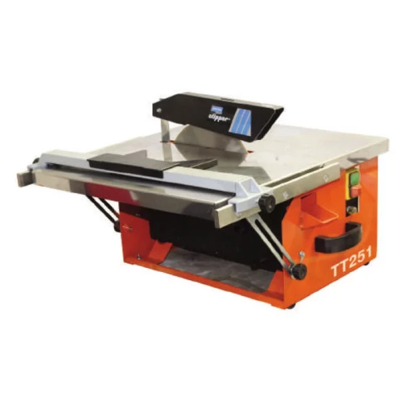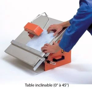 La TT 251, une carrelette puissante et facile d’entretien. Spécialement conçue pour les carreleurs, elle allie robustesse et puissance. Parfaite en complément d’une scie sur rail ! Scie livrée avec un disque diamant Clipper CLASSIC CERAM diamètre 250 mm Caractéristiques scie: 1 Disque diamant inclus : Ø 250 mm CLASSIC CERAM Tension : 230 V Puissance : 1000 W Fusible / Générateur : 16 A / 3 kVA Diamètre x alésage maxi. : Ø 250 x 25,4 mm Table inclinable : 0 à 45° Longueur de coupe maxi à 90° : 55 mm Longueur de coupe maxi à 45° : 35 mm Dimensions de la table : 560 x 500 mm Vitesse de l’outil maxi. : 2950 min-¹ Vibrations mains-bras : < 2,5 m/s² Pression sonore : 72 db(A) Dimensions de la table: 560 x 500 mm Dimensions (L x l x H): 1860 x 600 x 1170 mm Poids : 26 kg Avantages produit :• Moteur 1 000 W • Table inclinable en acier inoxydable • Bac à eau amovible • Coupe en biseau 0° à 45° • Nettoyage facile • Robustesse