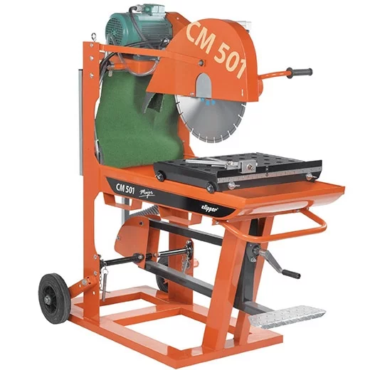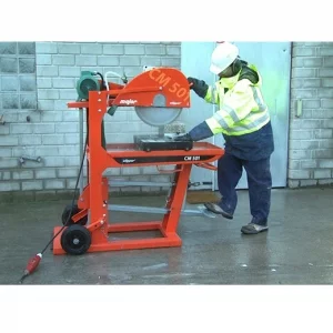 Scie de chantier hautement performante, robuste, au design moderne. Scie de maçon Bi-Tension 230V – 400V. Chariot avec surface traitée anti-glissement ce qui permet une coupe précise et stable. Maintien facile grâce à l’accès aisé à la pompe à eau. Guides pour levage, transport sûr et facile avec un chariot élévateur. Ajustement de la position du disque par manivelle ce qui permet un ajustement facile et précis de la profondeur de coupe. Chariot mobile sur roues inclinées anti-usure : la stabilité du chariot améliore la qualité de coupe. Coupe rapide, précise et aisée sans outil additionnel grâce au guide coupe standard à réglage angulaire de haute précision (degrés). Butée de profondeur de coupe réglage : réglage de profondeur de coupe aisé pour des disques de 300 à 400 mm. Carter de disque horizontal ce qui procure une bonne protection quel que soit la position de la tête. Livré sans disque. Caractéristiques scie de maçon : Marque : Norton Clipper Type de moteur : électrique Tension : 230V – 400V ˜3 Puissance : 4 kW Fusible / Générateur : 16 A / 10 kVA Diamètre x alésage maxi. : Ø 500 x 25,4 mm Profondeur de coupe maxi : 195 mm Longueur de coupe maxi : 500 mm Hauteur Maxi. du matériau : 355 mm Dimensions de table : 500 x 420 mm Vitesse de l’outil : 1900 min-¹ Vibrations mains-bras : < 2,5 m/s² Pression sonore : 81 db(A) Dimensions : 1480 x 610 x 1550 mm Poids : 163 kg Avantages produit : Chariot avec surface traitée anti-glissement Accès aisé à la pompe à eau Guide de coupe Ajustement de la position du disque par manivelle Guides pour levage Bénéfices utilisateur : Coupe précise et stable Maintenance facile Transport sur et facile avec un chariot élévateur Ajustement facile et précis de la profondeur de coupe